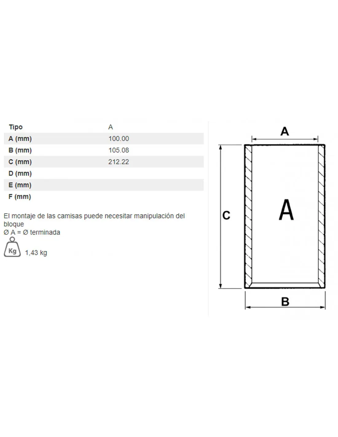CAMISA DE CILINDRO SEMITERMINADA Ø 100 X 105.08 MM - L 212.22 MM